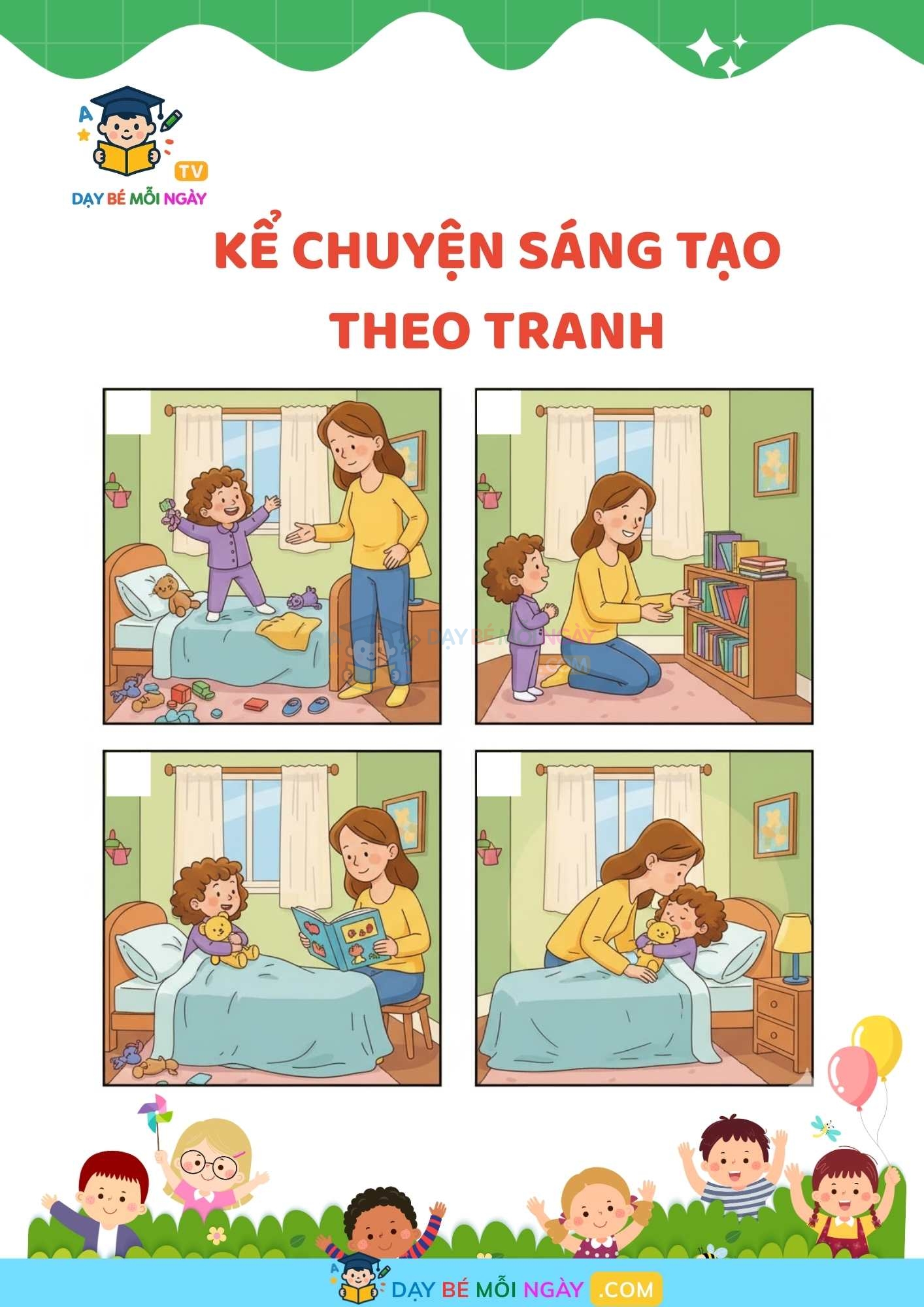 - Tranh kể chuyện sáng tạo: giúp con tập diễn đạt mạch lạc, dùng từ rõ ràng, biết kể lại câu chuyện theo trình tự.