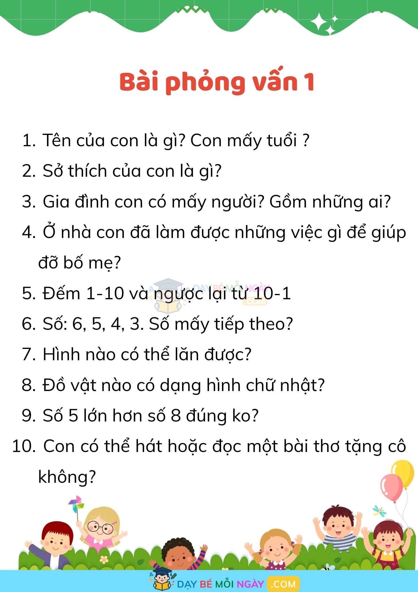 - 100 câu hỏi phỏng vấn chọn lọc: chia theo nhóm kỹ năng (ngôn ngữ, tư duy, kỹ năng sống, cảm xúc…) để bố mẹ dễ luyện từng phần.