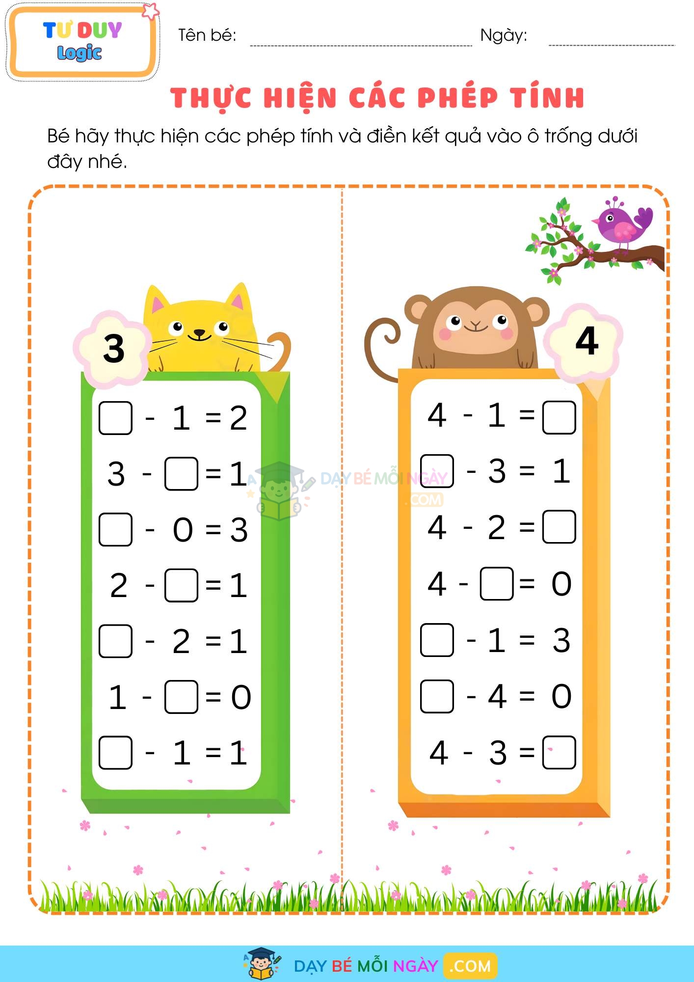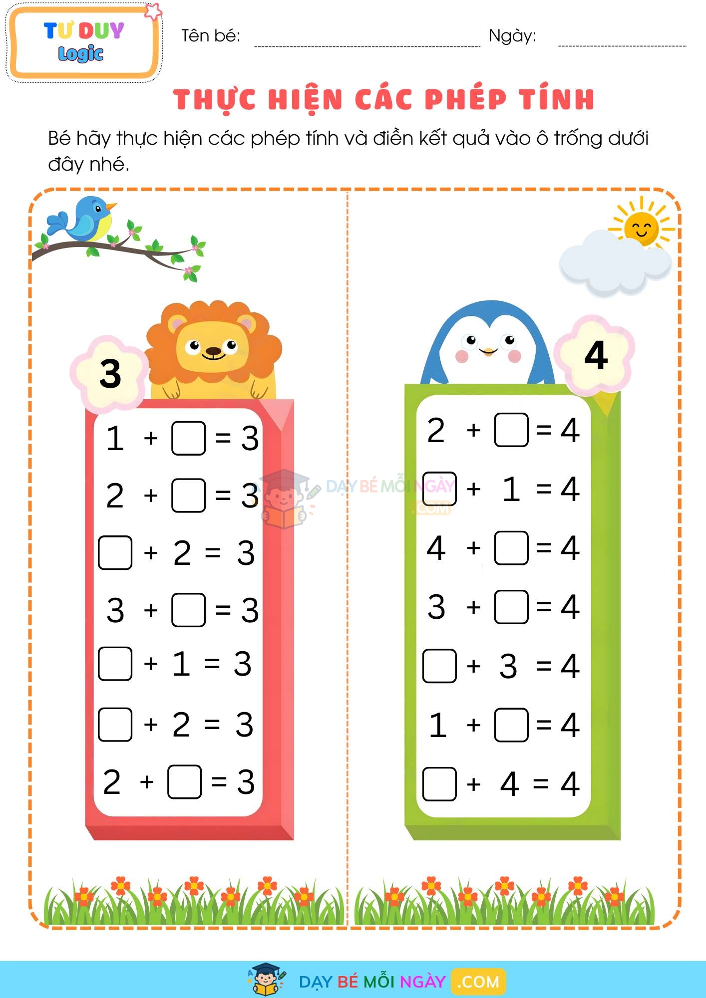 - Thành thạo phép cộng – trừ cơ bản: Hệ thống bài tập từ rất dễ đến nâng cao nhẹ (điền số còn thiếu, tìm thành phần chưa biết, xen kẽ cộng – trừ), giúp con rèn phản xạ nhanh, không bị “bí” khi gặp đề bài đổi kiểu.