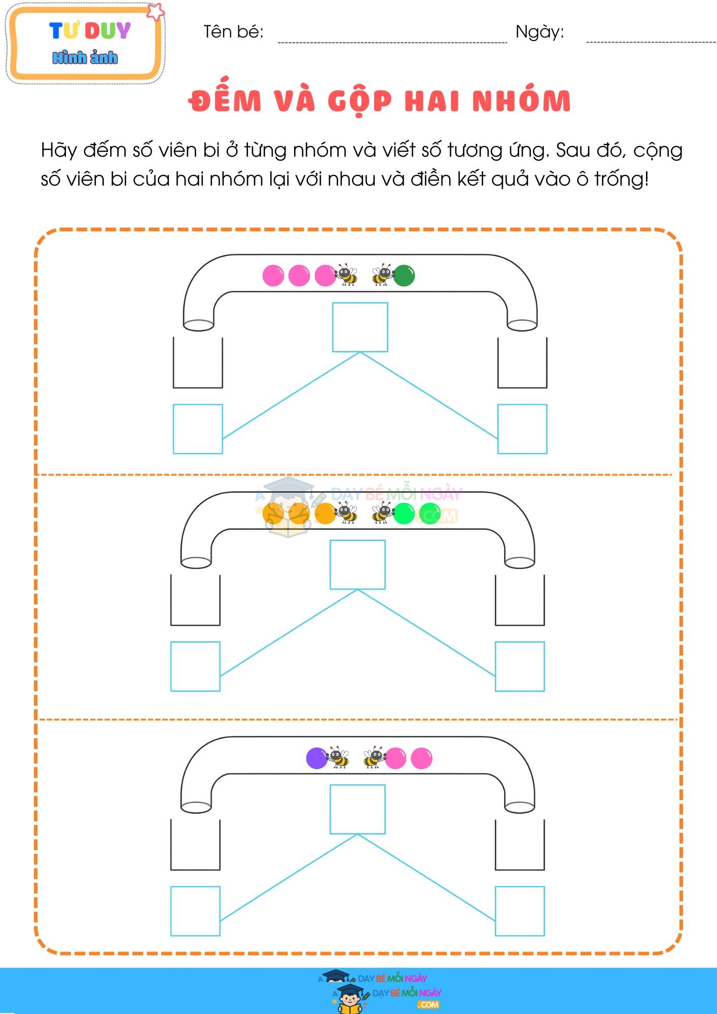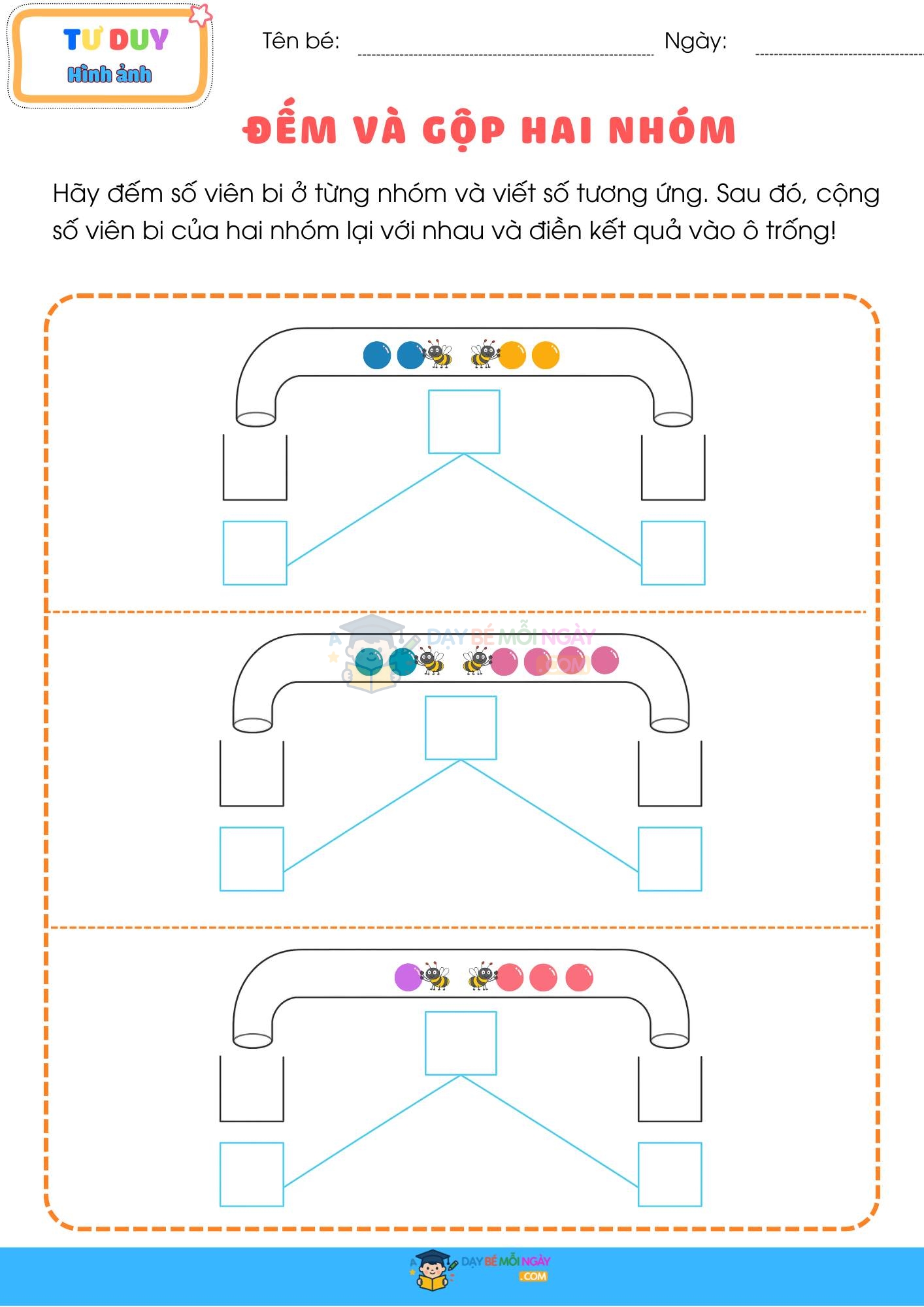 ✅ Đếm chính xác, tăng tập trung: bé quan sát số lượng từng nhóm, điền số tương ứng.