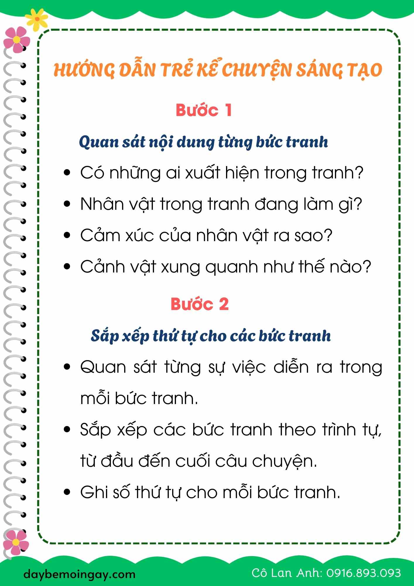- Tập kể lại bằng lời với các từ nối “đầu tiên – tiếp theo – sau đó – cuối cùng…”, giúp câu chuyện mạch lạc, rõ ý.