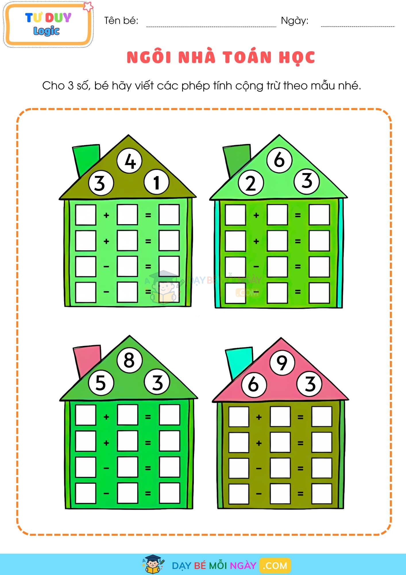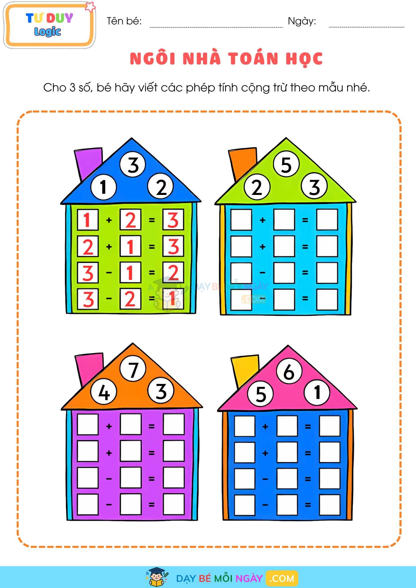 hãy mua ngay file “Ngôi Nhà Toán Học – Cộng trừ trong phạm vi 20” để bắt đầu buổi học toán vui như trò chơi cho con nhé! 🏠➕➖