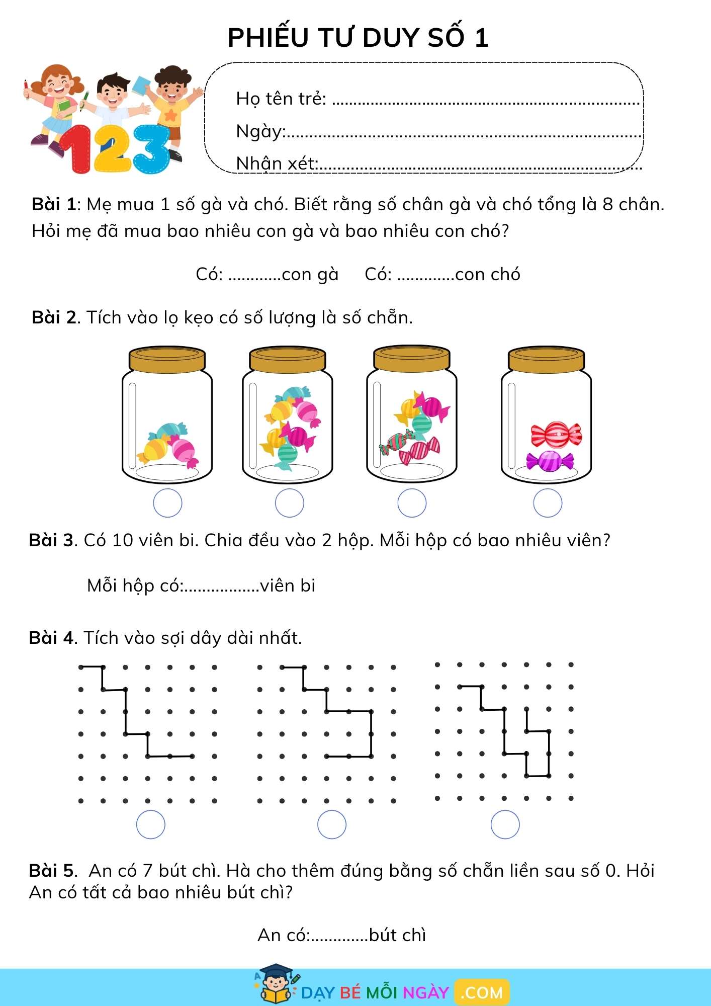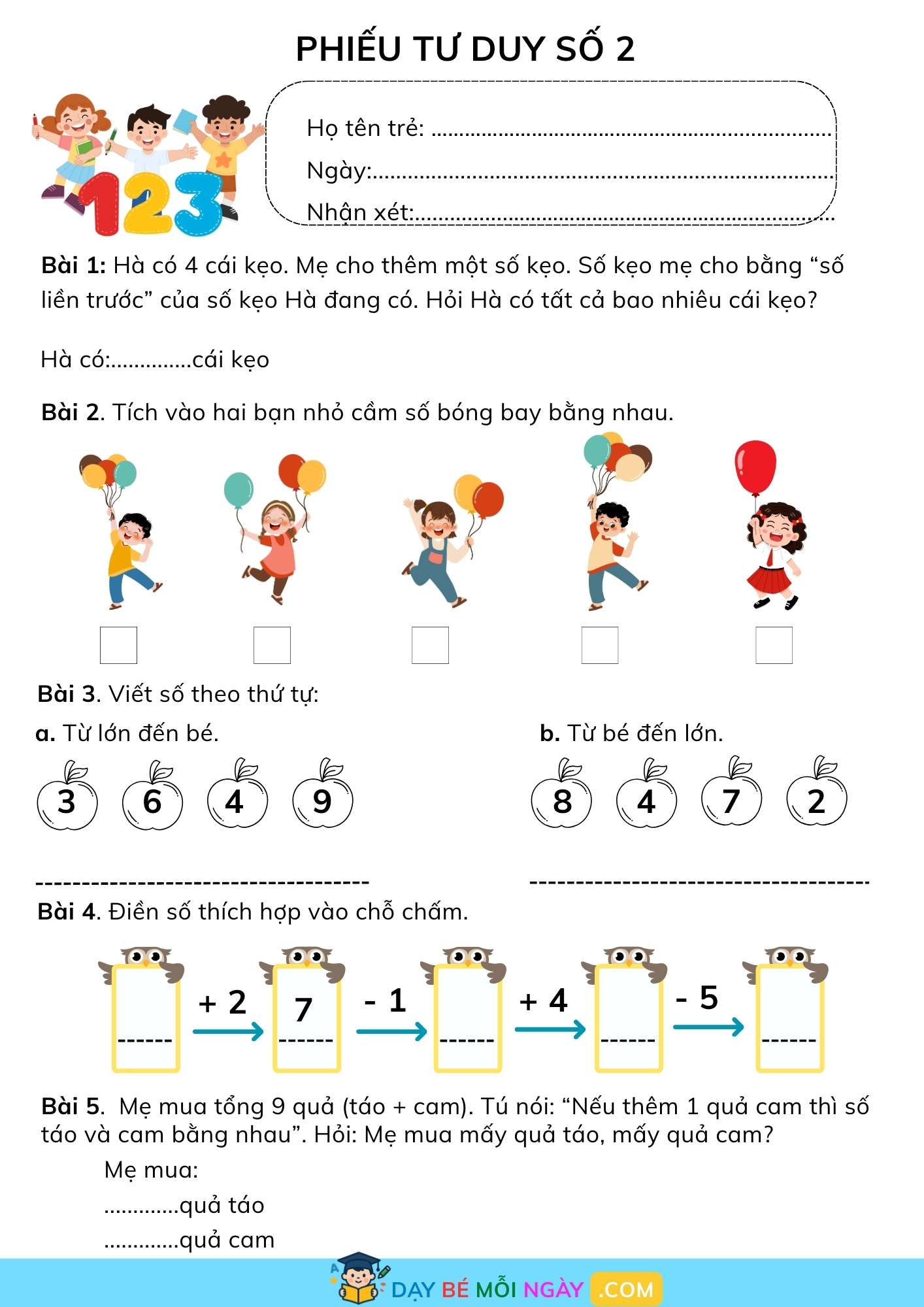 - Ngoài ra Phiếu Luyện Toán Tư Duy còn có các bài toán có lời văn, bài suy luận, chia đều, tìm quy luật, sắp xếp thứ tự,… rèn cho trẻ khả năng suy nghĩ có lý lẽ, biết thử – sai, phán đoán và tự tin trình bày kết quả.