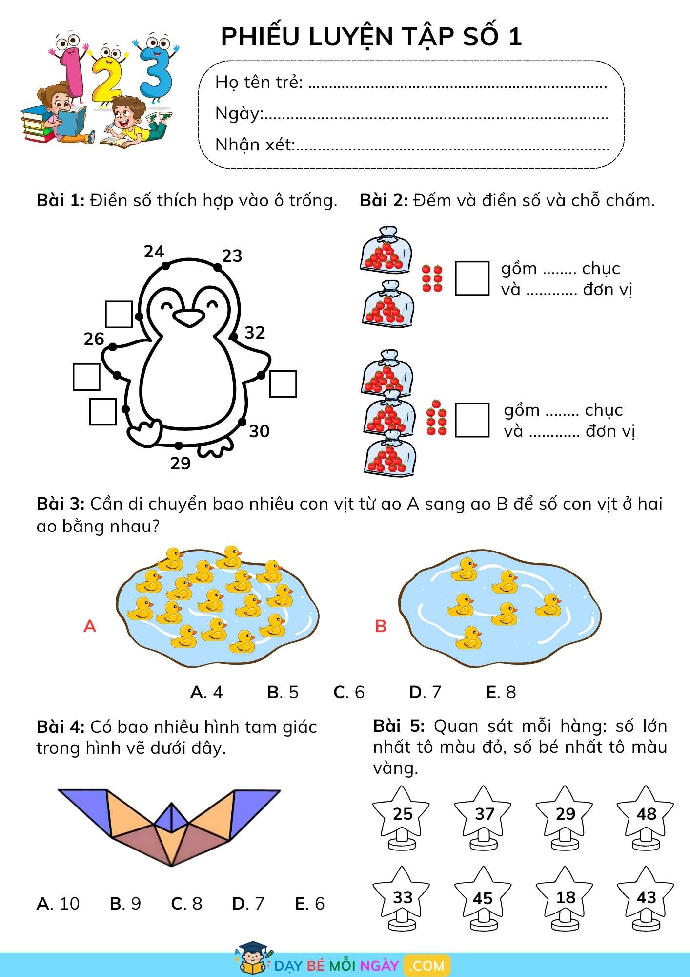 - Phiếu Luyện Toán Tư Duy: bám sát chương trình Toán lớp 1, củng cố các kĩ năng: đếm, so sánh, tách gộp, thêm bớt cần đến sự tư duy logic trong phạm vi 10 đến 100. Ngoài ra con được học quy luật, so sánh độ dài – ngắn, nhiều – ít, đếm cạnh, đếm hình và các khối…