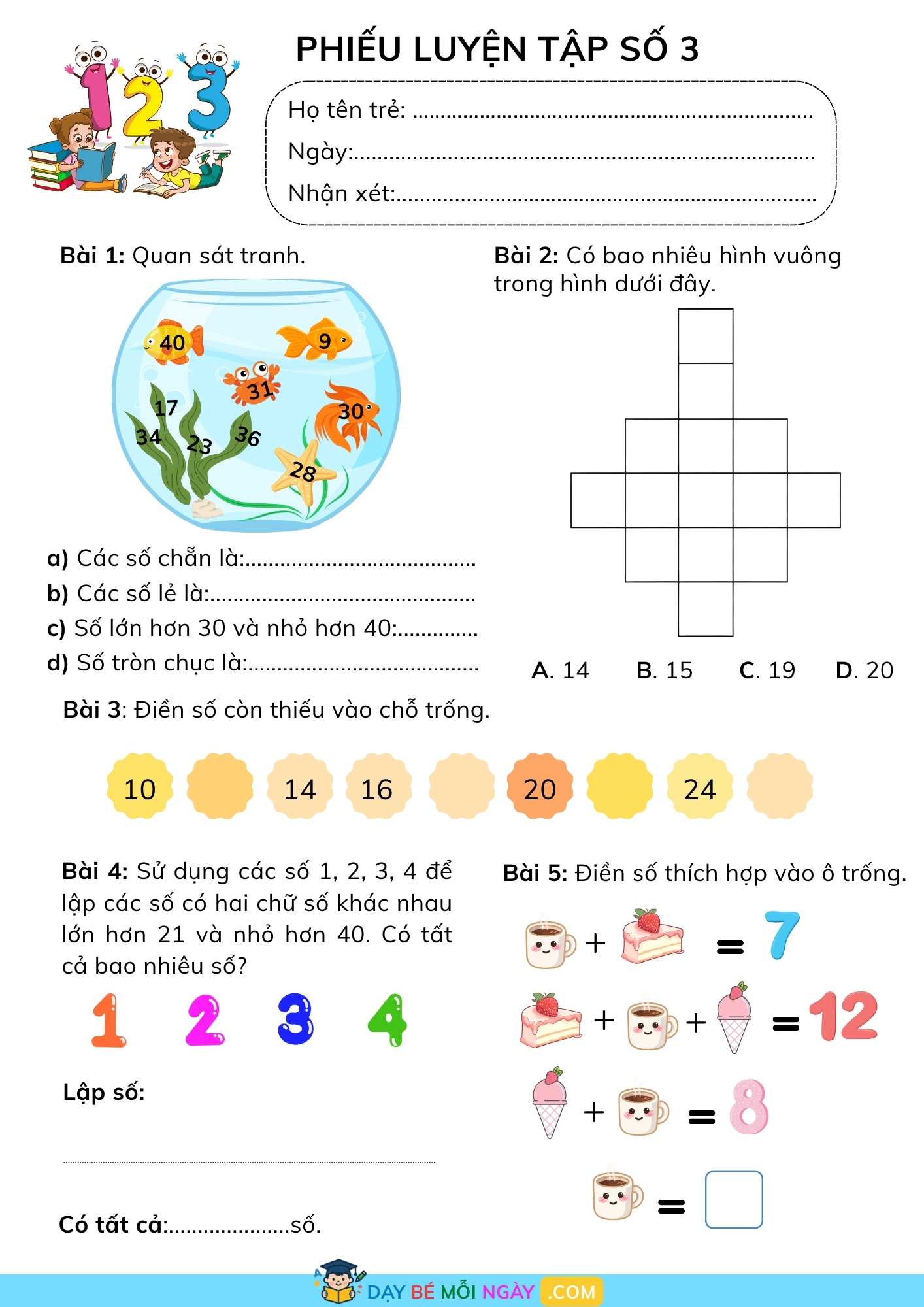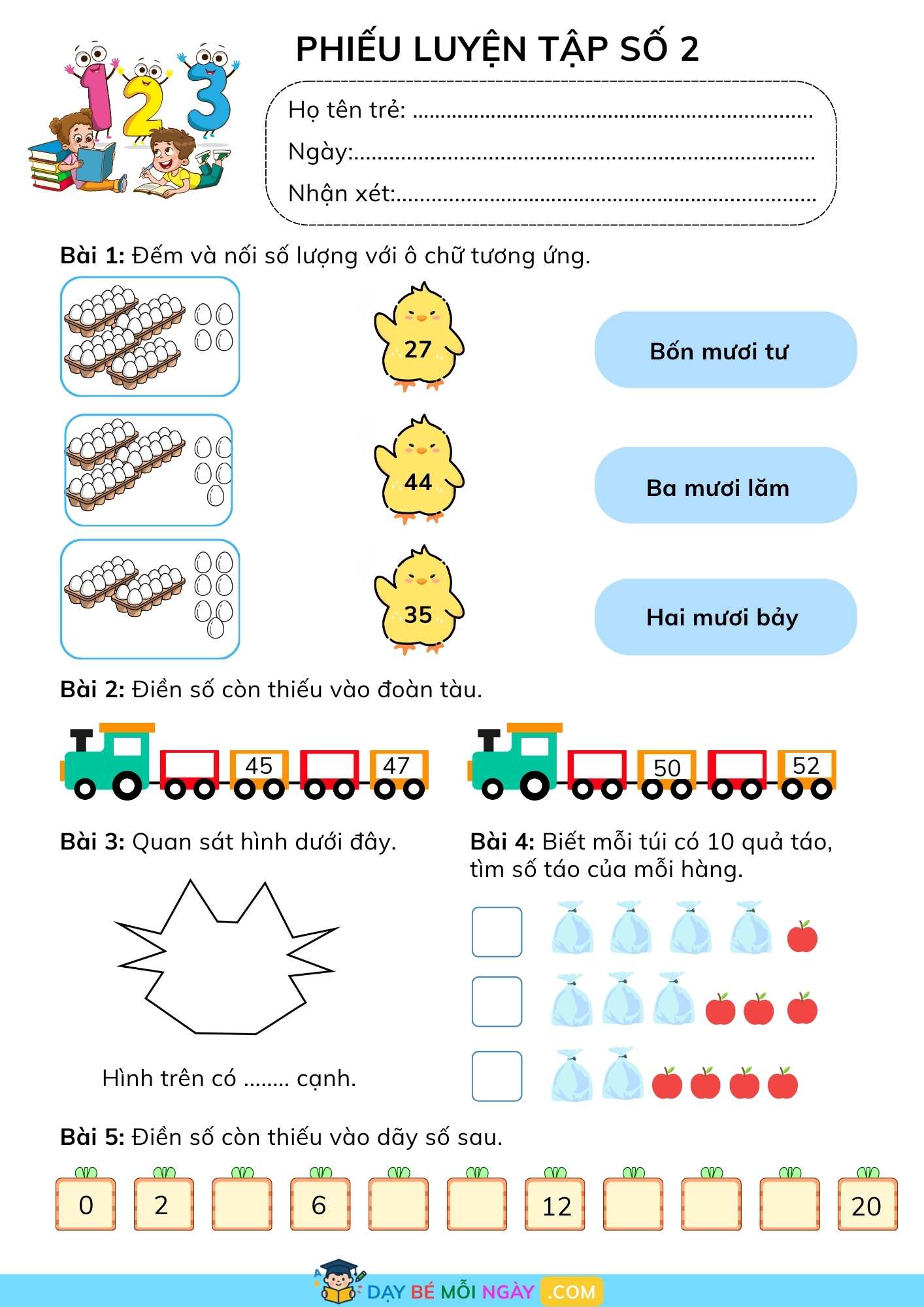 Mỗi phiếu đều có ô ghi họ tên, ngày làm, nhận xét rất tiện để giáo viên hoặc phụ huynh theo dõi sự tiến bộ của con.