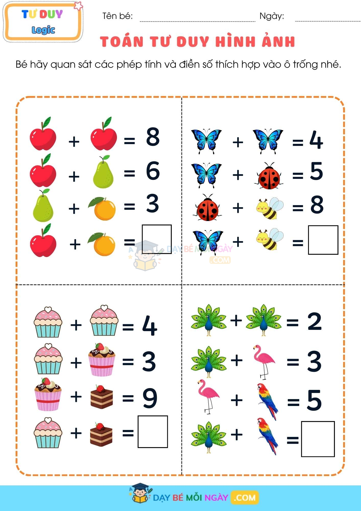 Thay vì những phép tính khô khan, mỗi bài là một “câu đố bằng hình”. Mỗi hình mang một giá trị bí mật, nhiệm vụ của bé là quan sát – suy luận – tìm ra đáp án. Bé vừa phải tính toán, vừa phải suy nghĩ logic như một “nhà thám tử nhí”.