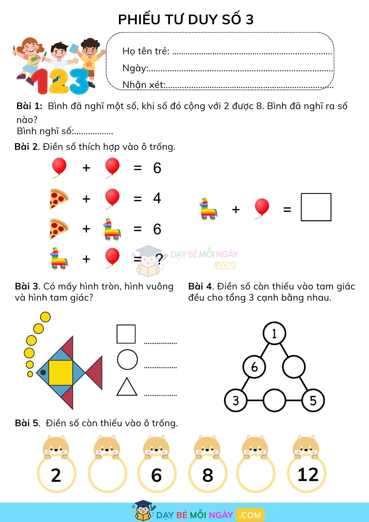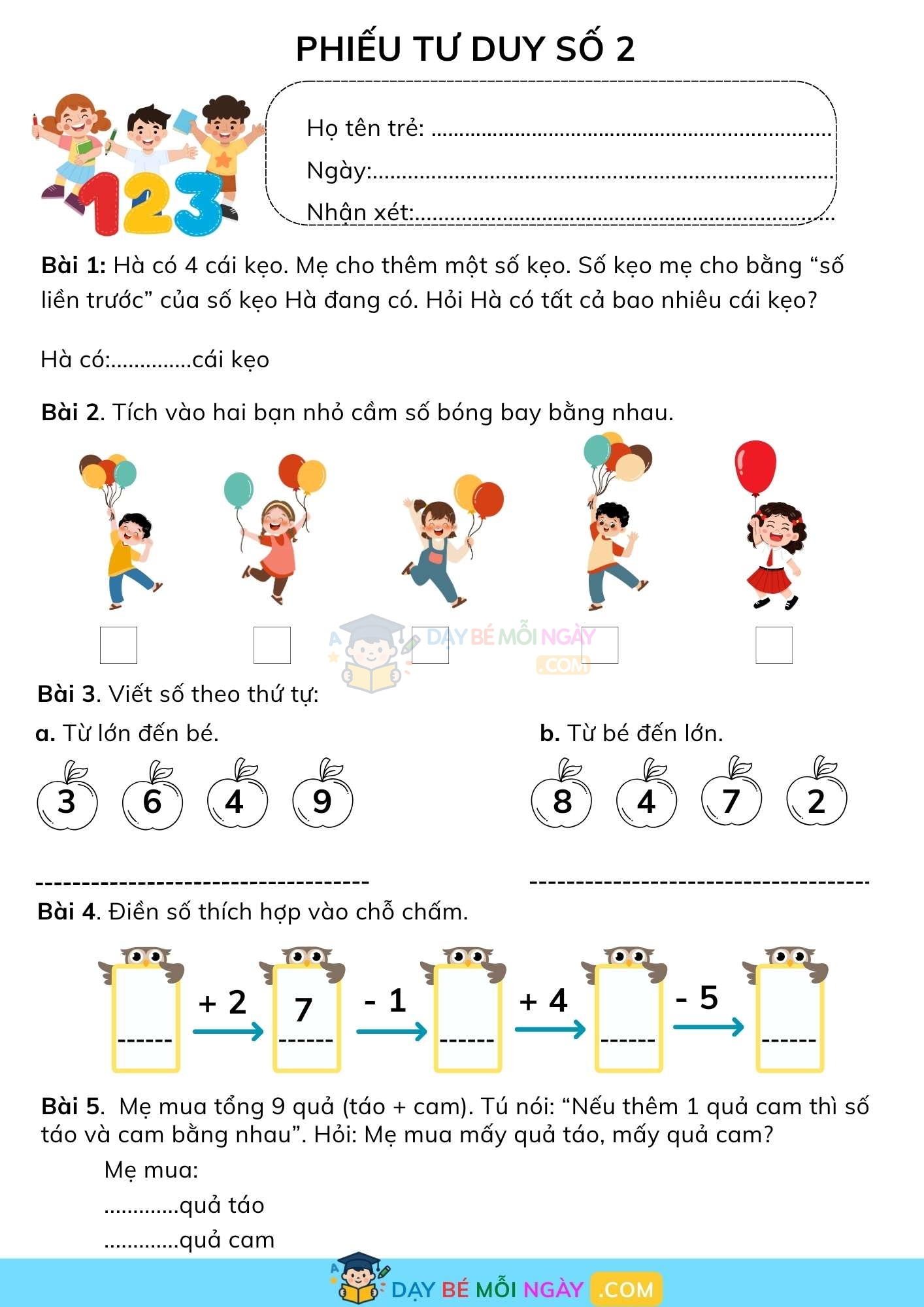- Ngoài ra Phiếu Luyện Toán Tư Duy còn có các bài toán có lời văn, bài suy luận, chia đều, tìm quy luật, sắp xếp thứ tự,… rèn cho trẻ khả năng suy nghĩ có lý lẽ, biết thử – sai, phán đoán và tự tin trình bày kết quả.