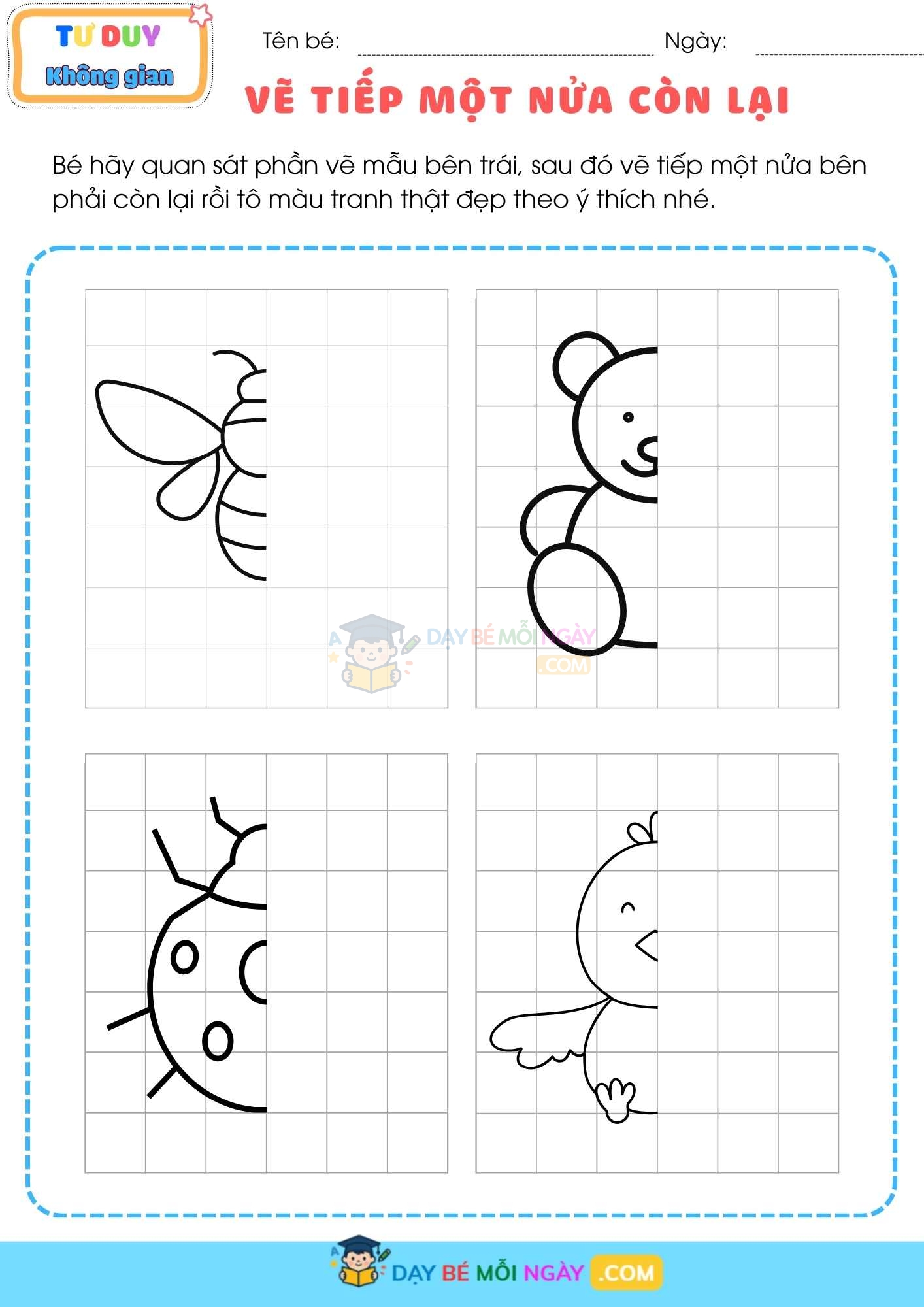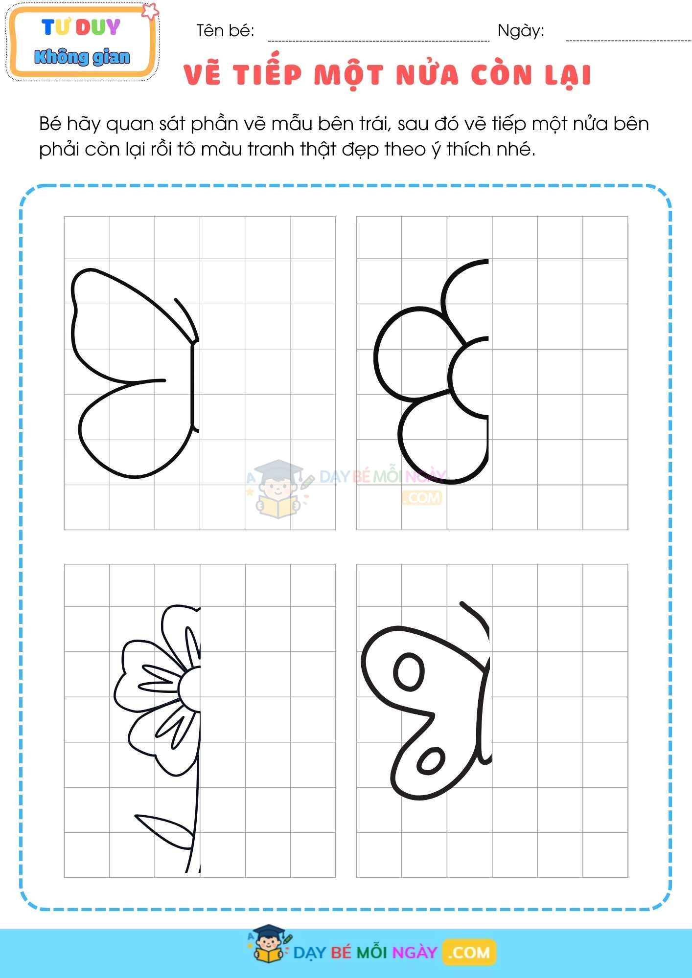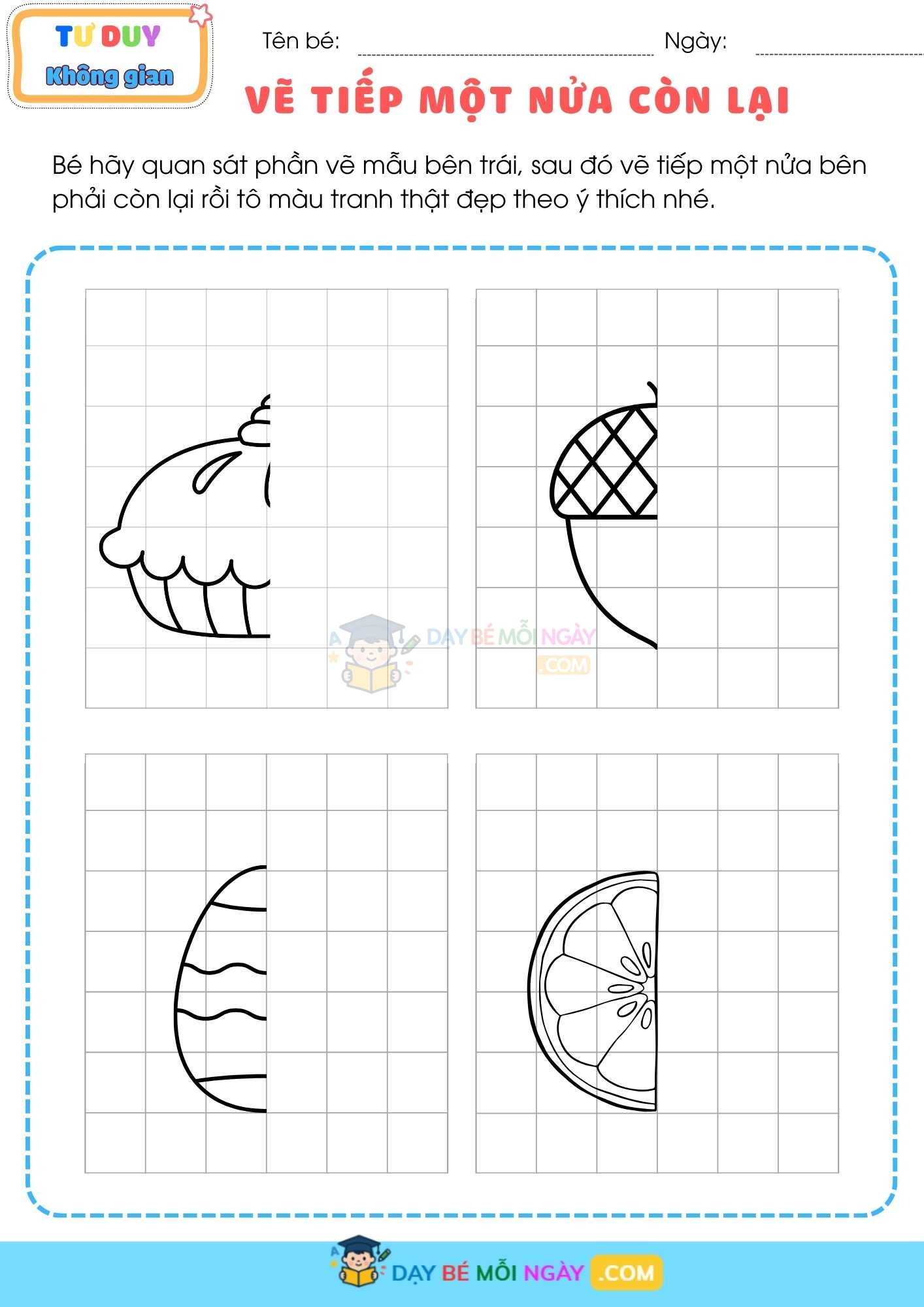 “VẼ TIẾP MỘT NỬA CÒN LẠI” là bộ file nhỏ xinh gồm 9 trang, mỗi trang lại có các bài là hình ảnh khác nhau có thể mang lại cho con bạn cả một thói quen: quan sát, tập trung và kiên trì hoàn thành bức vẽ của riêng mình.